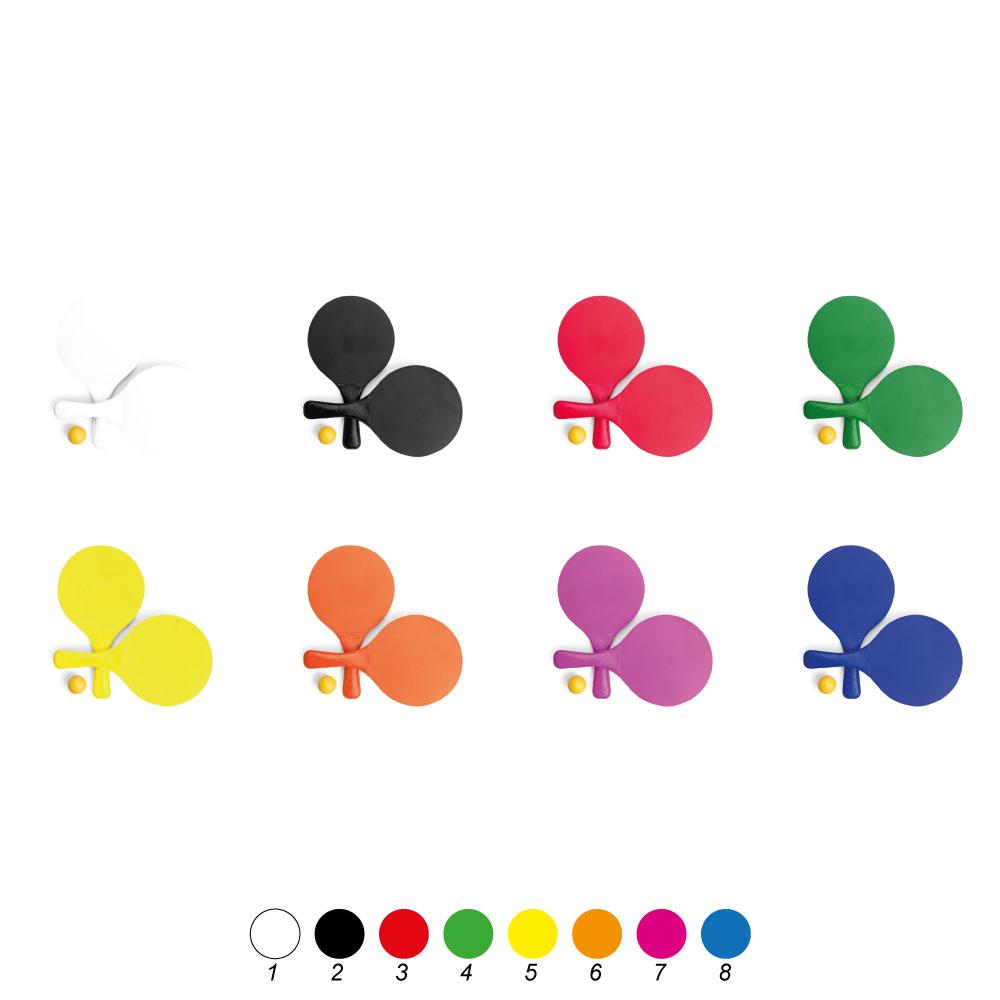 Par de palas de playa de alta calidad en madera natural de variada gama en vivos colores. Con mango reforzado a juego y presentadas en bolsa redecilla con pelota.
