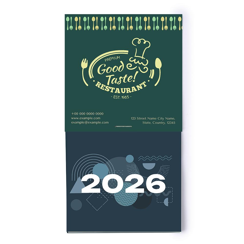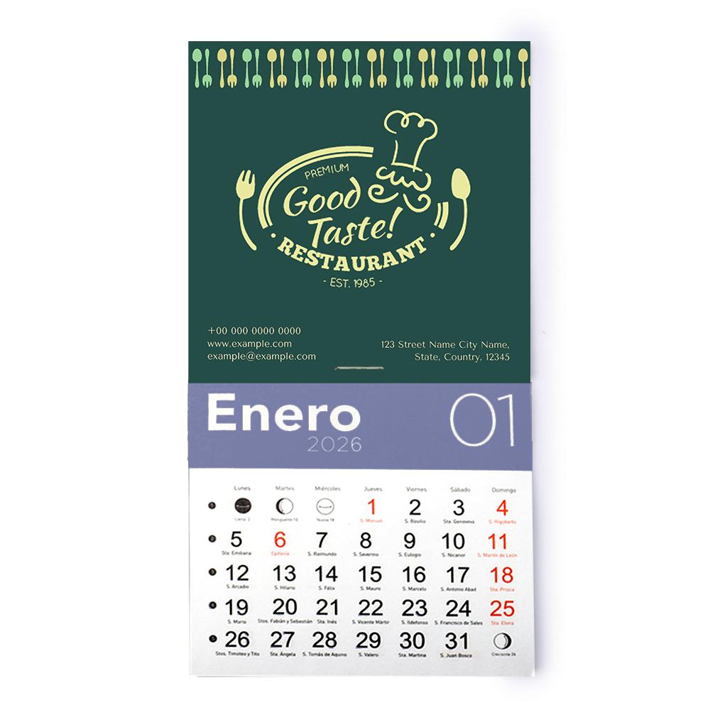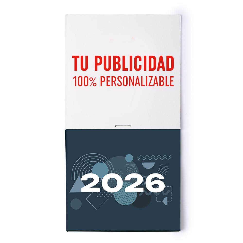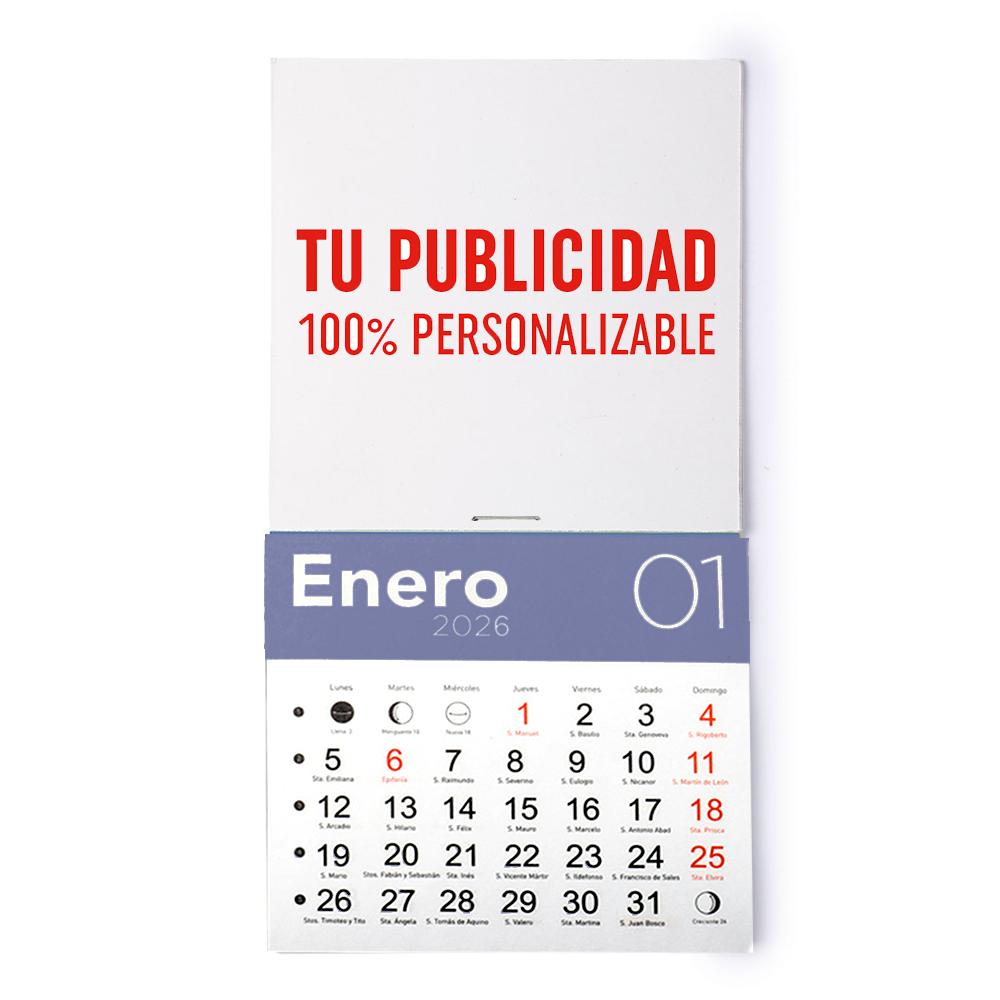 Almanaque mensual, una hoja por mes, con cabecera de 10 cm x 10 cm personalizable. Imán en la parte trasera.
