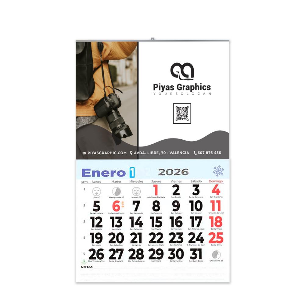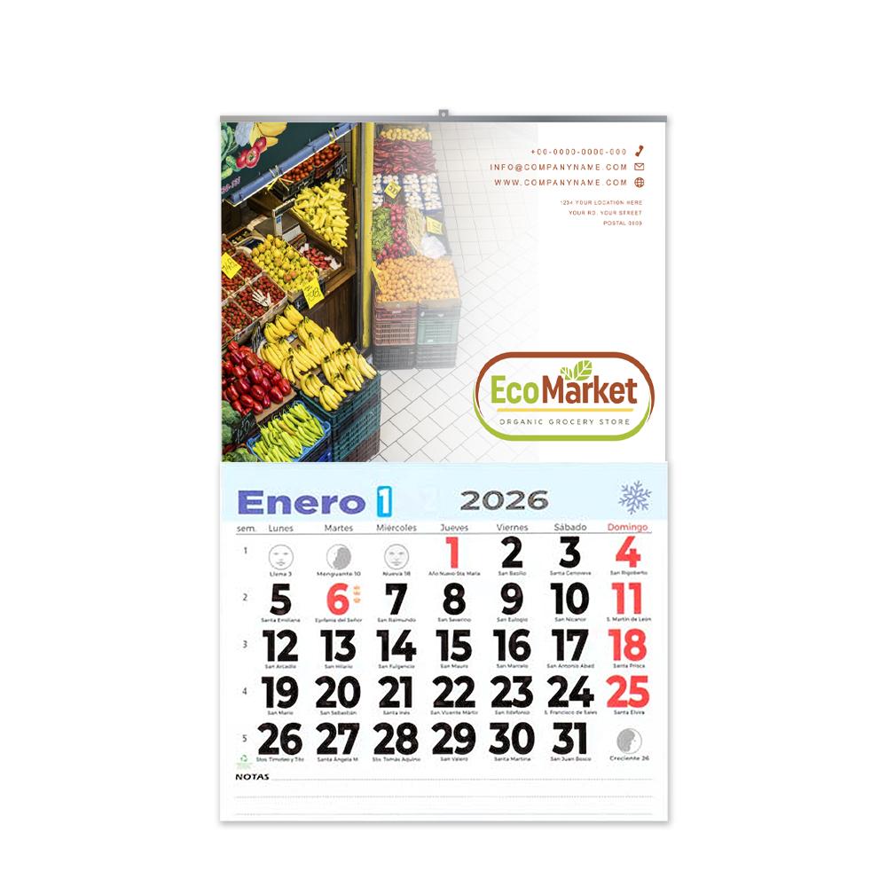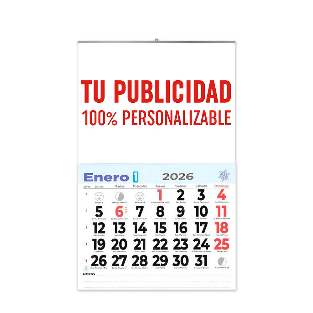 Almanaque mensual, una hoja por mes, con cabecera de personalizable. Varilla fabricada en metal de alta calidad con el ojal troquelado.