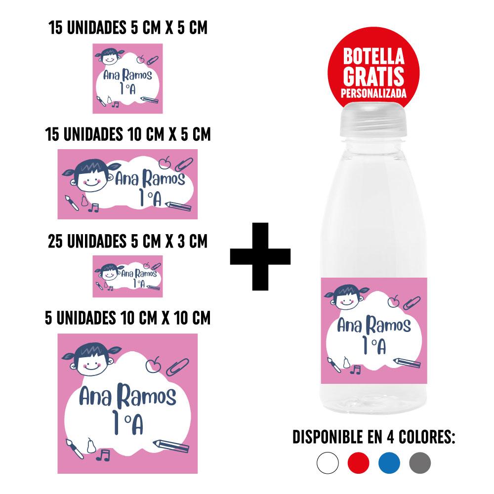 Pack 60 Pegatinas Personalizadas con Botella de Regalo - Dibujo Niña