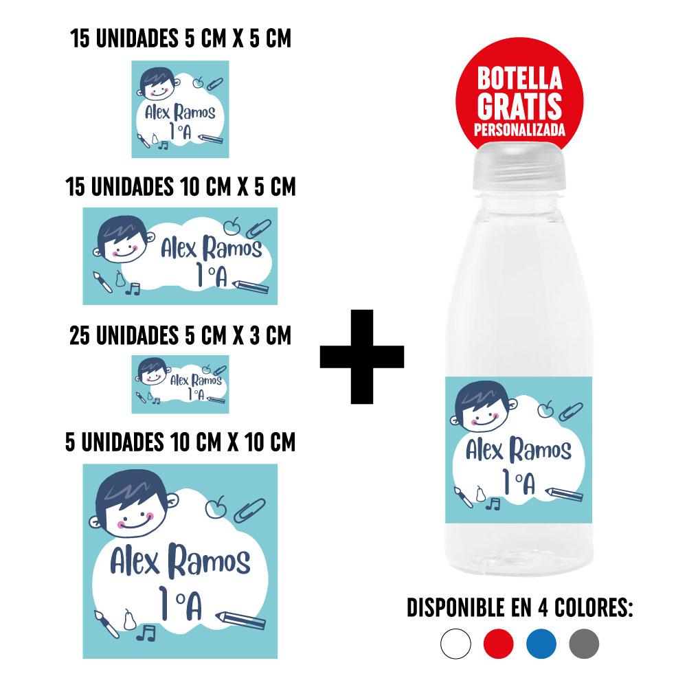 Pack 60 Pegatinas Personalizadas con Botella de Regalo - Dibujo Niño