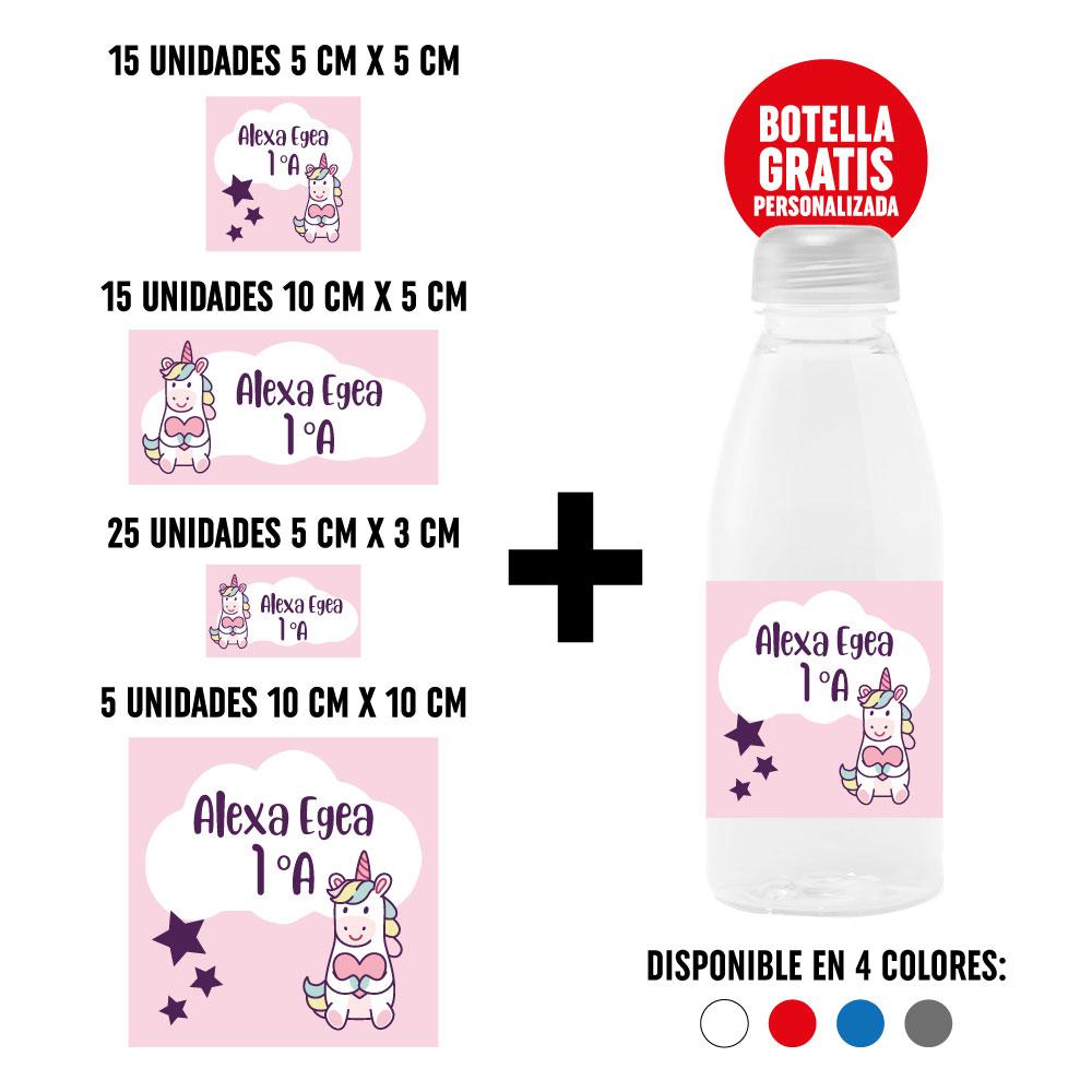 Pack 60 Pegatinas Personalizadas con Botella de Regalo - Unicornio