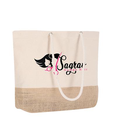 Bolsa de línea nature, en combinación de materiales yute y algodón. Tamaño 48 x 35 + 15 cm, de acabado cosido y con asas largas reforzadas de 90 cm en algodón. Resistencia de hasta 9 kg de peso.