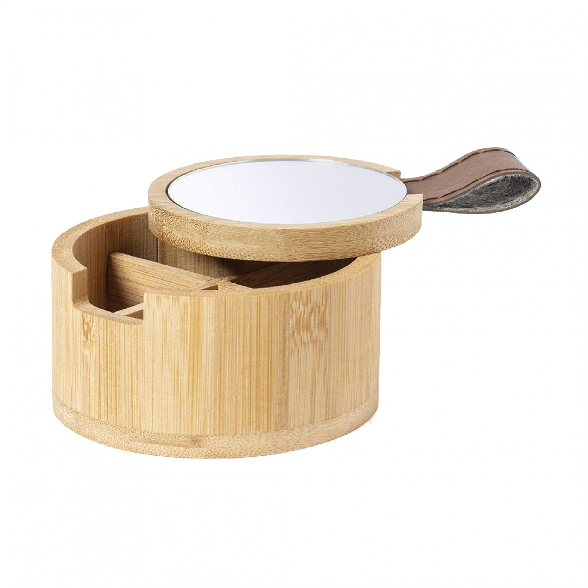 Pack de 5 ó 10 unidades (a elegir) de joyero de línea nature fabricado en bambú. Con 4 compartimentos interiores, tapa con tirador de PU y espejo 1X de 6cm de diámetro integrado en tapa. Con film protector.