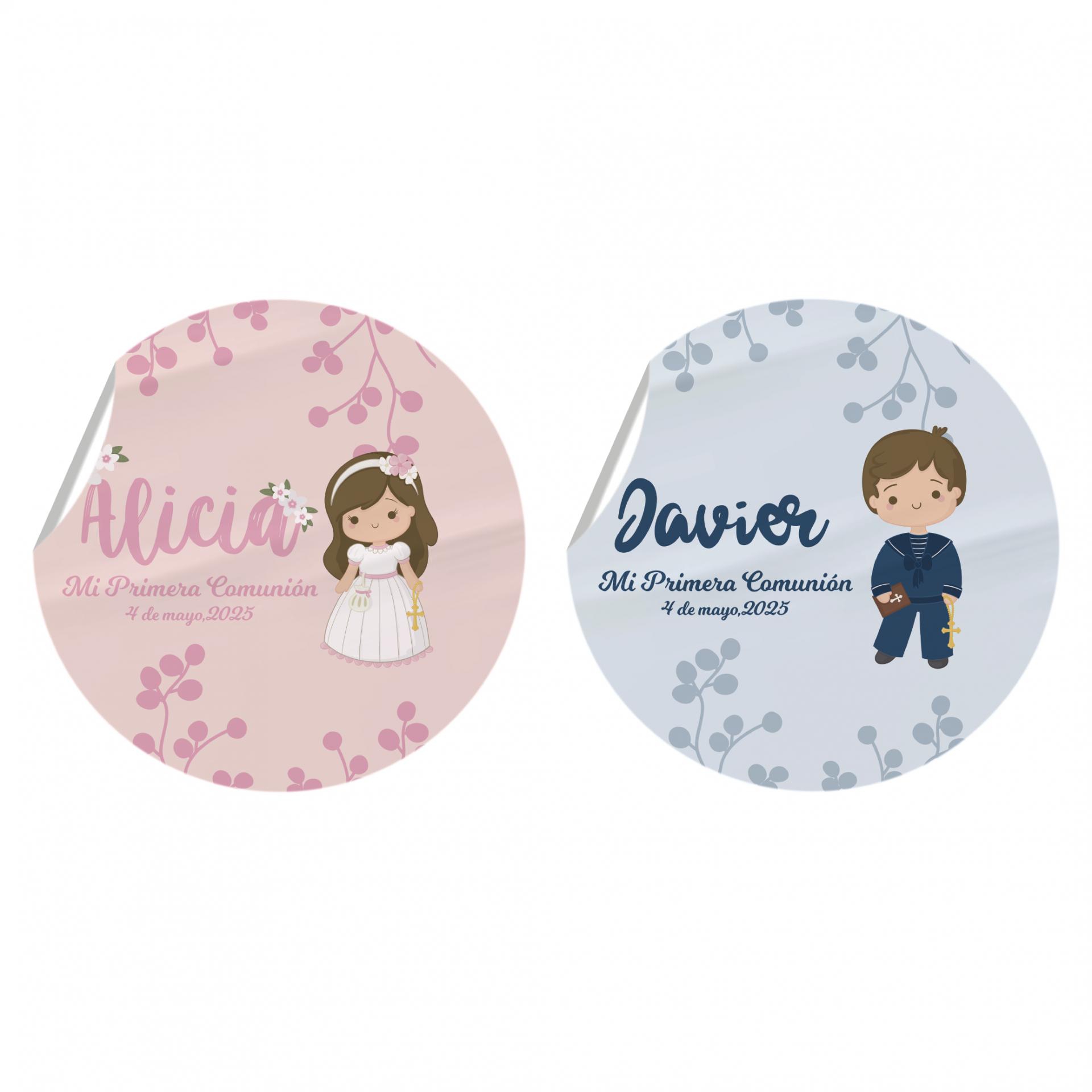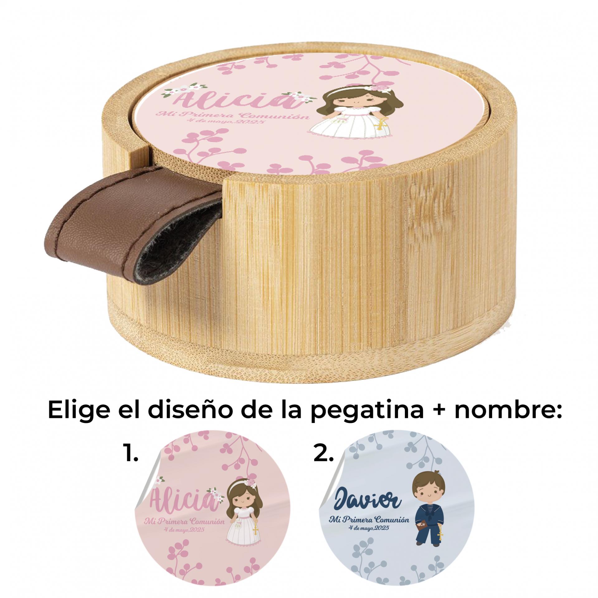 Posibilidad de personalización en joyero: pegatina con muñecos de comunión a elegir entre rosa o azul + nombre con fecha.